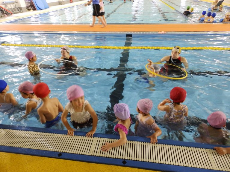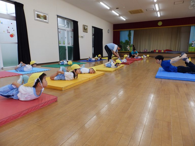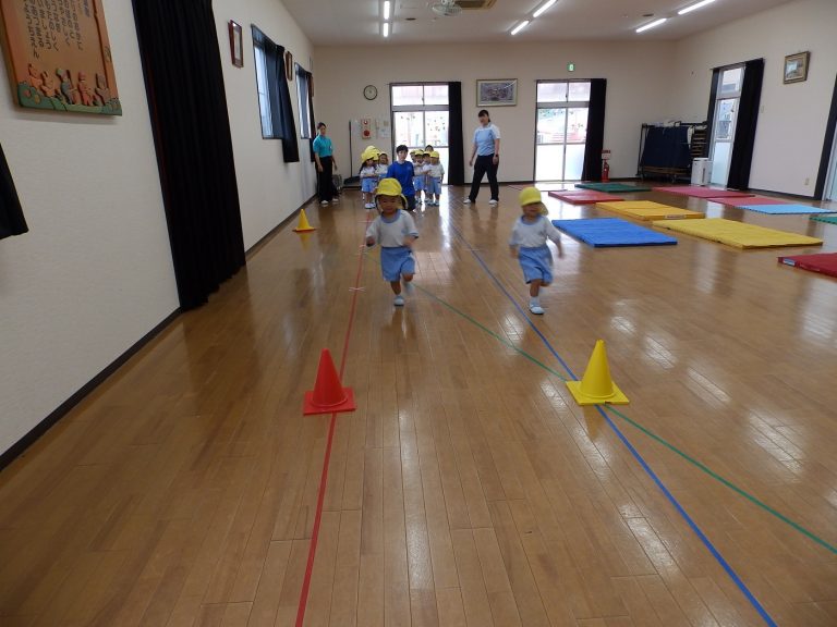 年中組では、スイミングがありました。水やコーチに少しずつ慣れてきました。見学にお家の方が来ているので、笑顔で頑張っていました。年少組では、体育指導がありました。準備体操の後、かけっこの練習をしました。