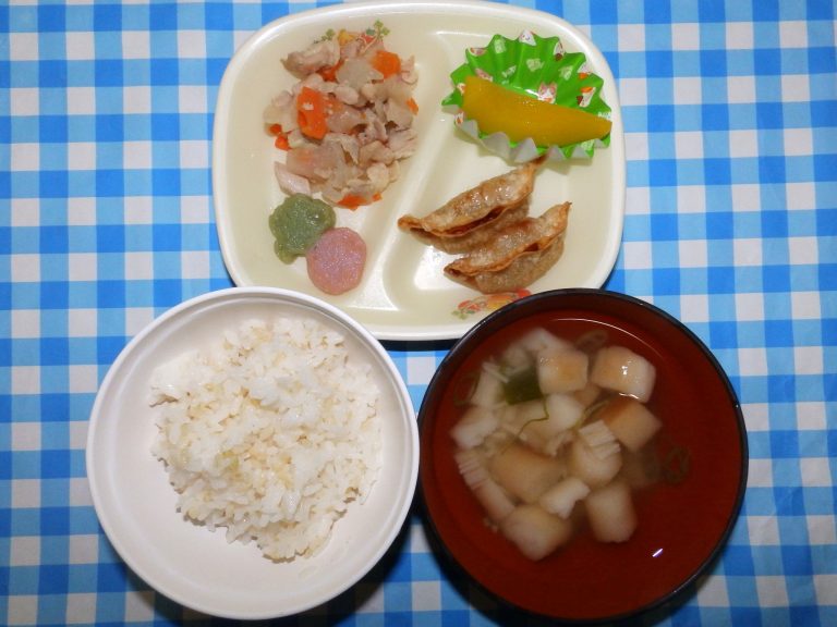・ごはん・すまし汁 ・鶏と大根の煮付・ぎょうざ ・赤かぶかまぼこの煮付・もも缶