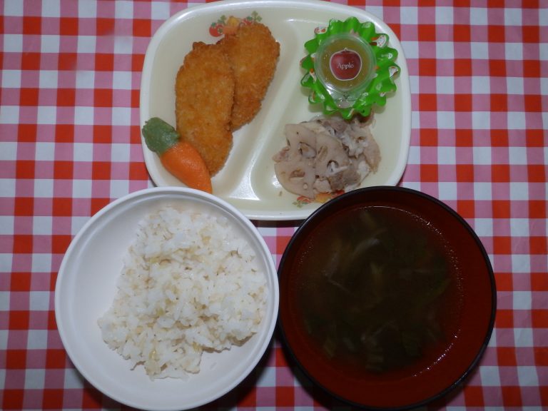 ・ごはん・中華スープ ・ササミフライ・レンコンの甘辛煮 ・野菜かまぼこの煮付・ミニゼリー