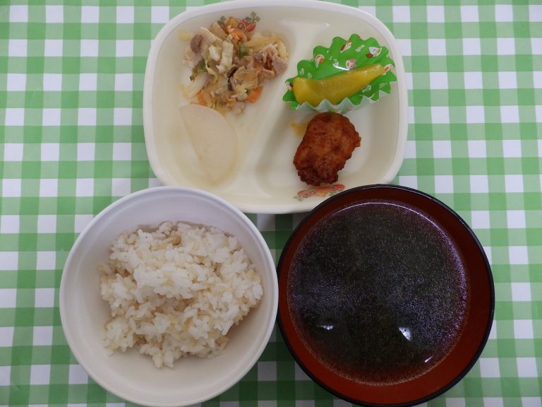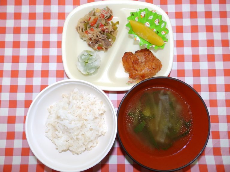 ・ごはん・わかめスープ ・回鍋肉・甘辛チキン ・大根の煮付・もも缶