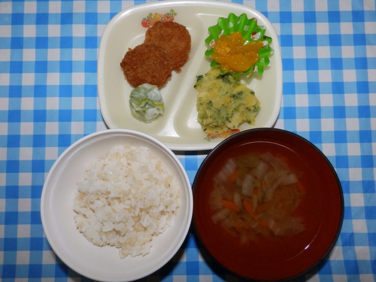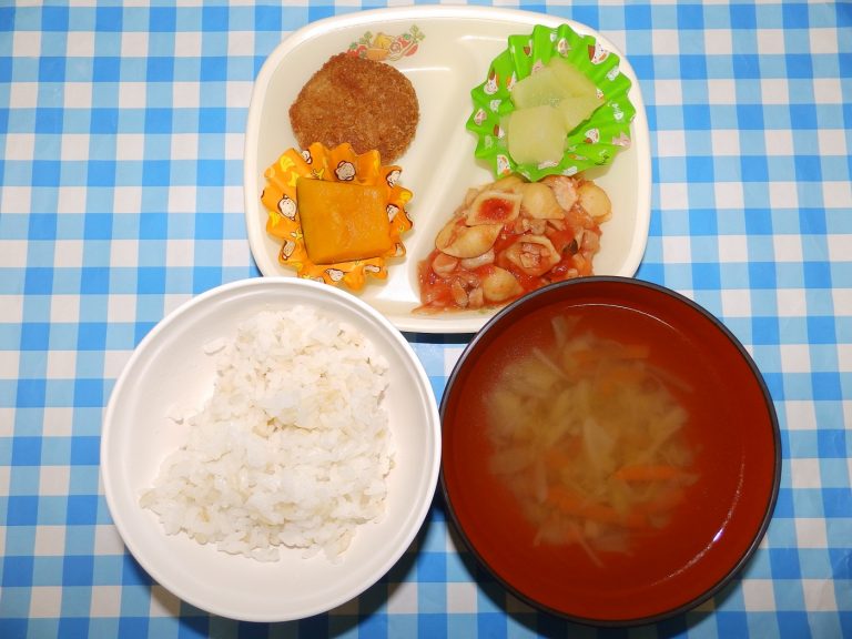・ごはん・コンソメスープ ・メンチカツ・トマトマカロニ ・かぼちゃの煮付・りんご缶