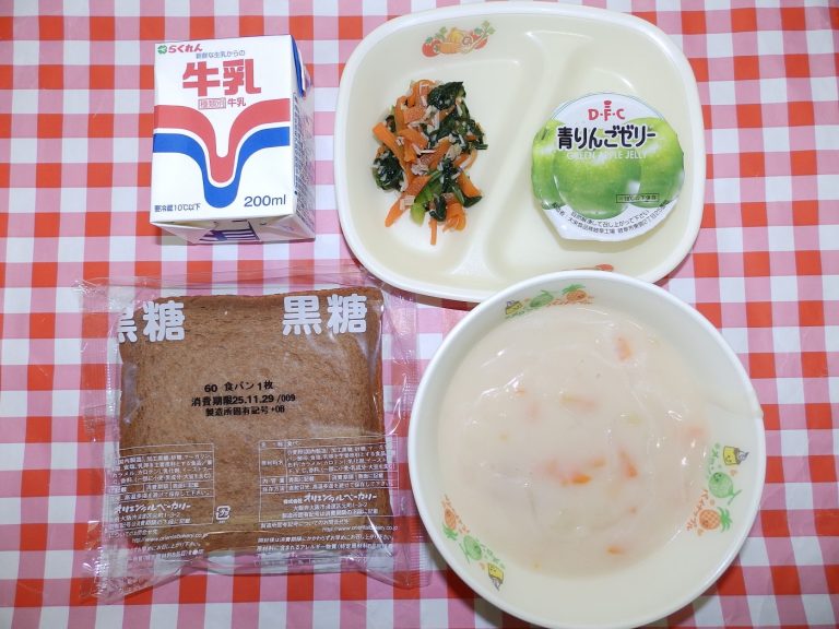 ・黒糖食パン・クリームシチュー ・葉菜とえのきの和え物 ・青りんごぜリー・牛乳