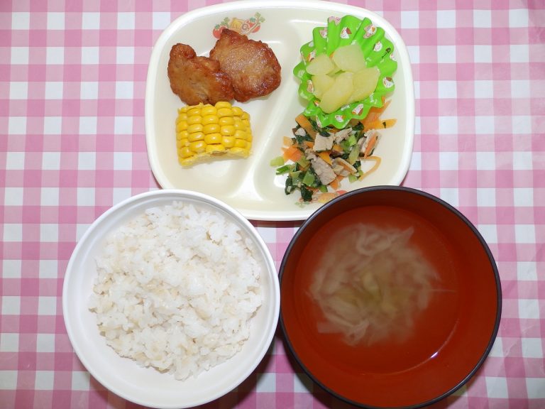 ・ごはん・わかめスープ ・照焼ハンバーグ・じゃが芋のコンソメ煮 ・とうもろこしのつまみ揚げ・オレンジ