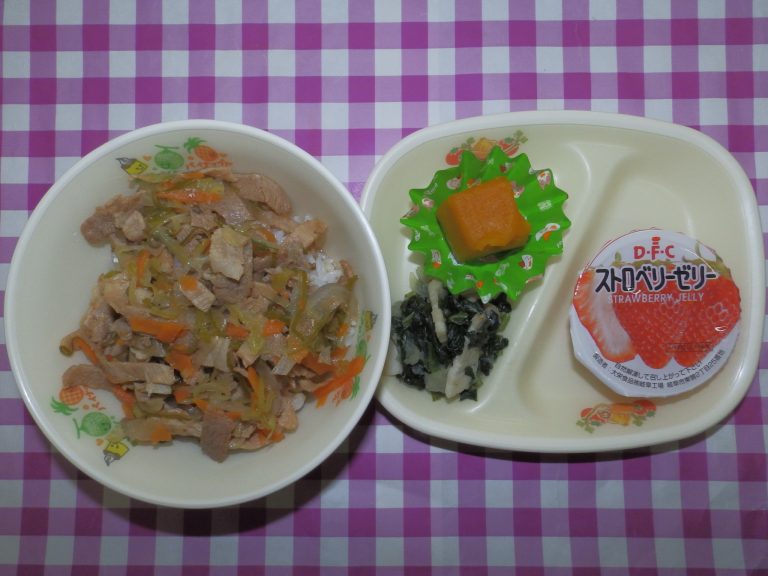 ・ごはん・豚生姜焼丼 ・ほうれん草と玉ねぎのソテー ・かぼちゃの煮付・いちごゼリー