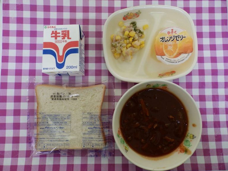 ・食パン・ハヤシシチュー ・白菜のサラダ・オレンジゼリー・牛乳
