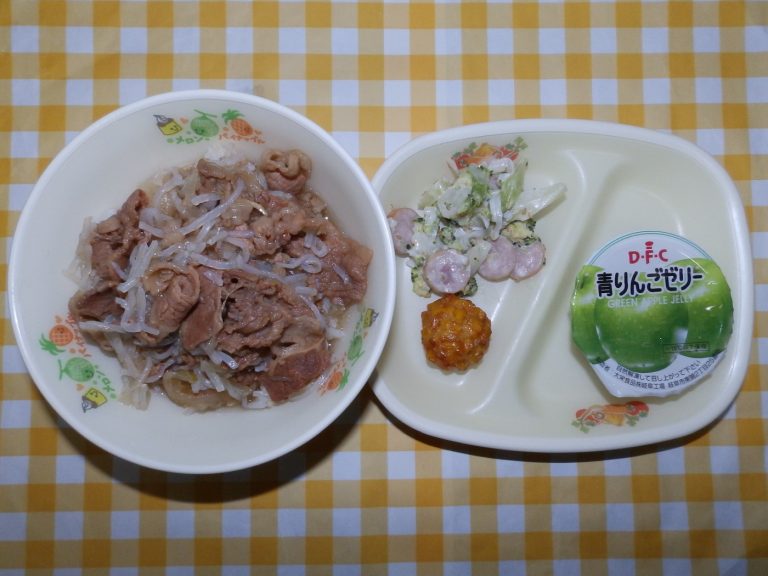 ・ごはん・牛丼 ・ブロッコリーのごまマヨサラダ ・とうもとろこしのつまみ揚・青りんごゼリー