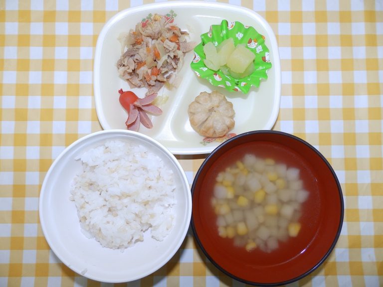 ・ごはん・コンソメスープ ・豚肉の甘辛炒め・レンコン饅頭 ・ウインナー・りんご缶