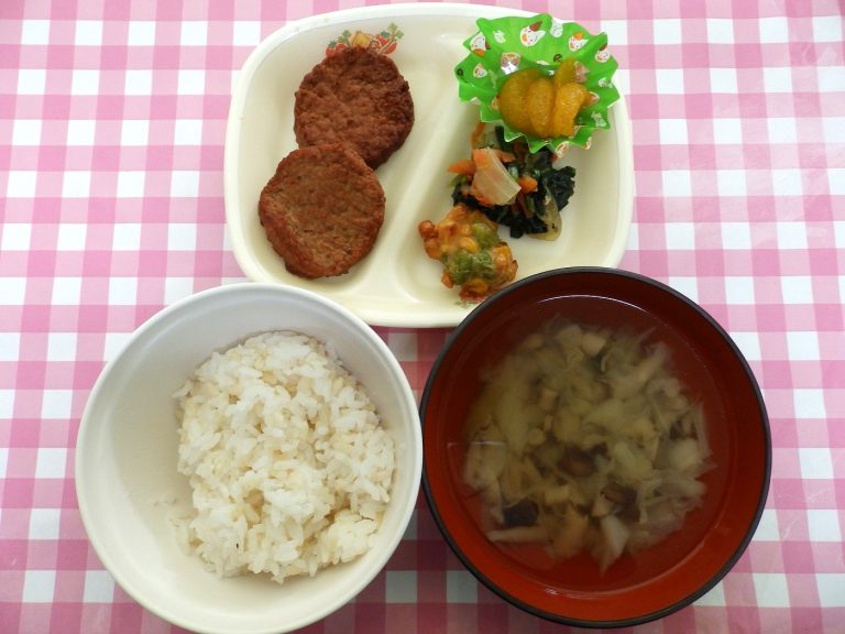 ・ごはん・コンソメスープ ・照焼ハンバーグ・葉菜のポン酢サラダ ・枝豆ととうもろこしのつまみ揚げ・みかん缶