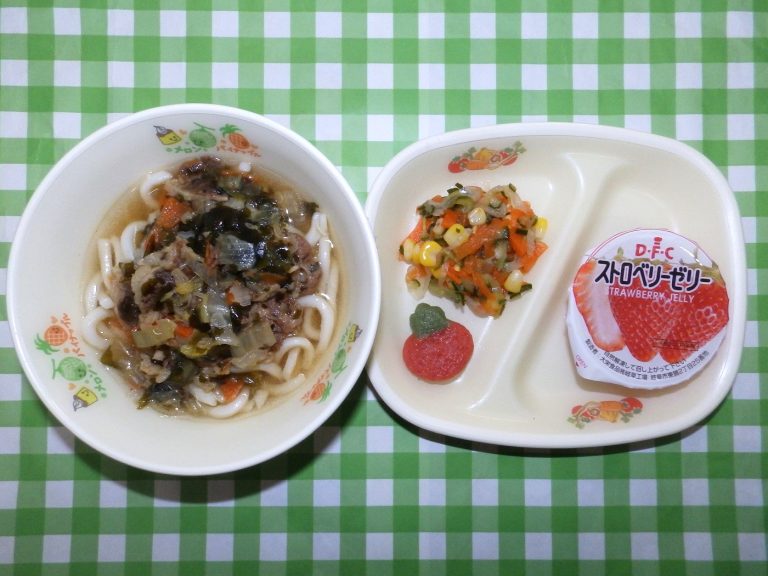 ・肉うどん・きゅうりの酢の物 ・野菜かまぼこの煮付 ・いちごゼリー