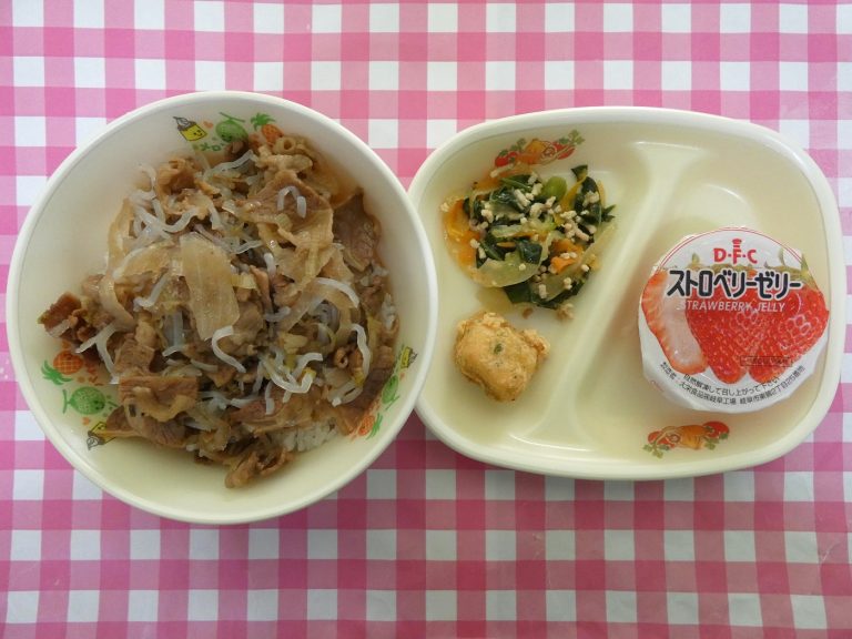 ・ごはん・牛丼 ・葉菜の中華炒め ・たけのこ天ぷら・いちごゼリー