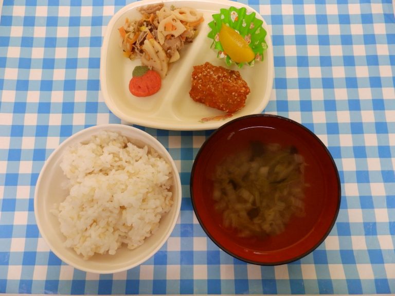 ・ごはん・すまし汁 ・牛肉とレンコンの甘辛炒め・もも缶 ・ごまささみカツ・野菜かまぼこの煮付
