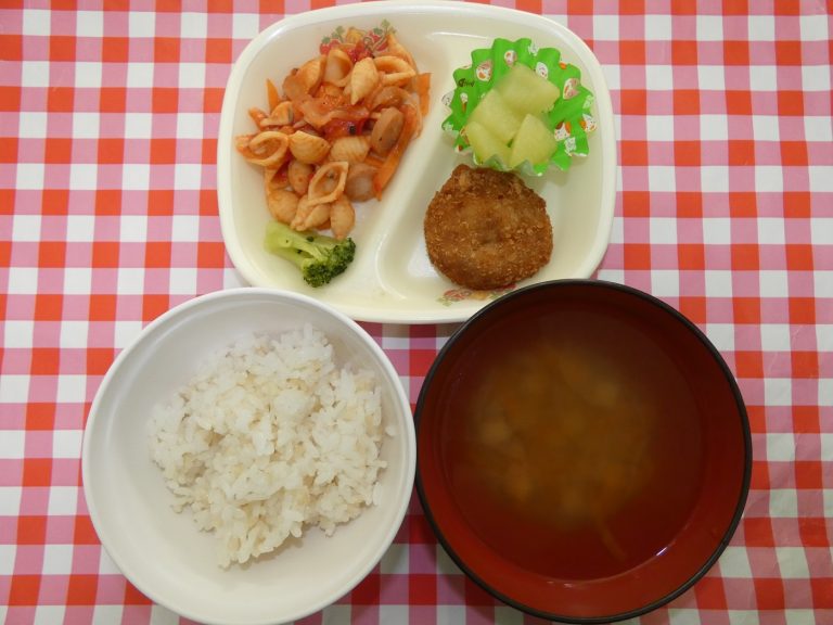 ・ごはん・コンソメスープ ・トマトマカロニ・メンチカツ ・ブロッコリーの煮付・りんご缶