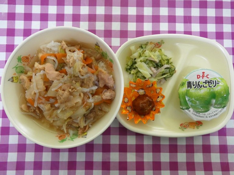 ・ごはん・鶏すき丼 ・葉菜とハムのサラダ ・肉団子・青りんごゼリー