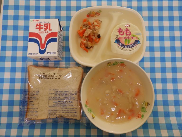 ・食パン・クリームシチュー ・葉菜とベーコンのコンソメ煮 ・ももゼリー・牛乳