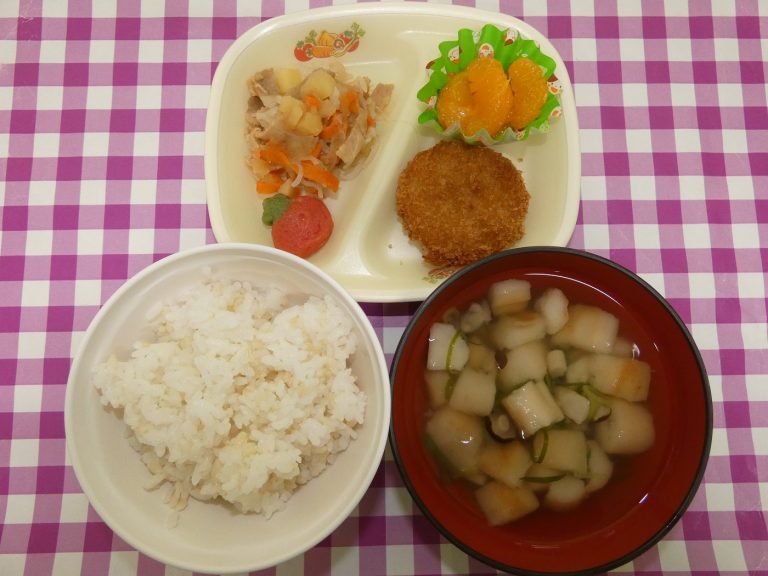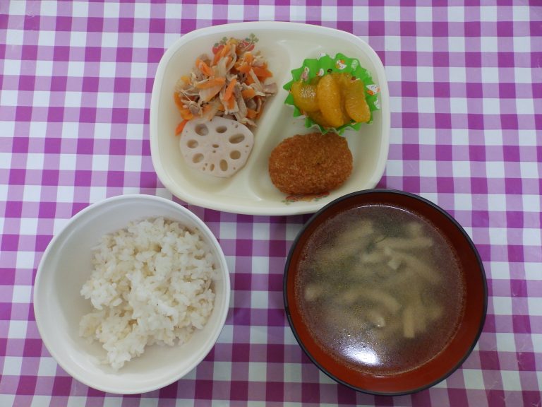 ・ごはん・すまし汁 ・豚の生姜焼・カレーコロッケ ・れんこんの煮付・みかん缶
