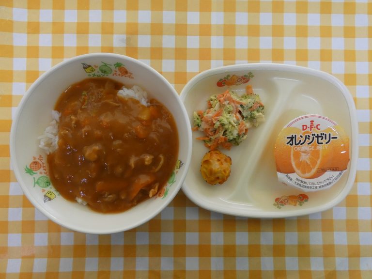 ・ごはん・カレー ・ブロッコリーサラダ・オレンジゼリー ・とうもろこしのつまみ揚げ