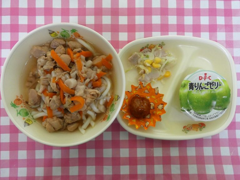 ・肉うどん ・きゅうりの酢の物 ・とうもろこしのつまみ揚・いちごゼリー