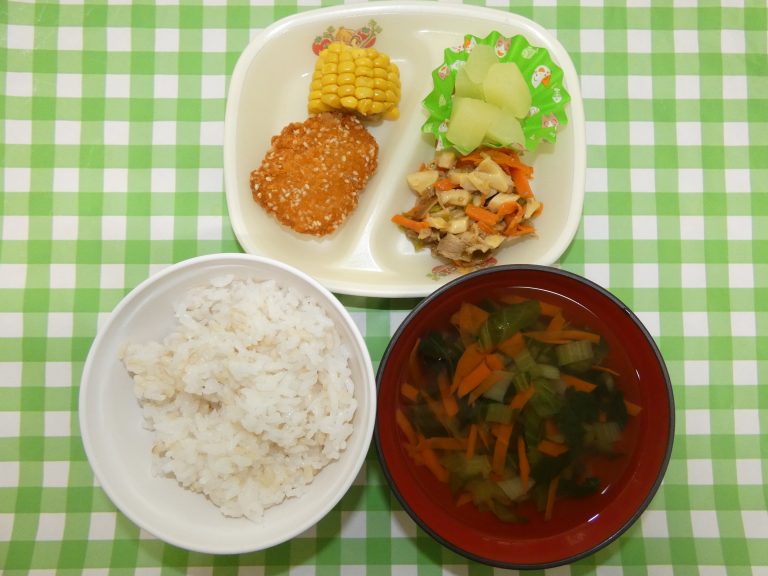 ・ごはん・すまし汁 ・チンジャオロースー・ごまささみカツ ・ハーフカットコーン・りんご缶