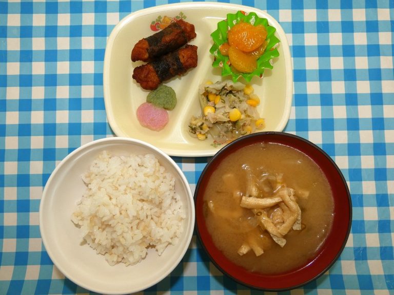 ・ごはん・味噌汁 ・のり巻き唐揚・キャベツとコーンのサラダ ・赤かぶかまぼこの煮付・みかん缶