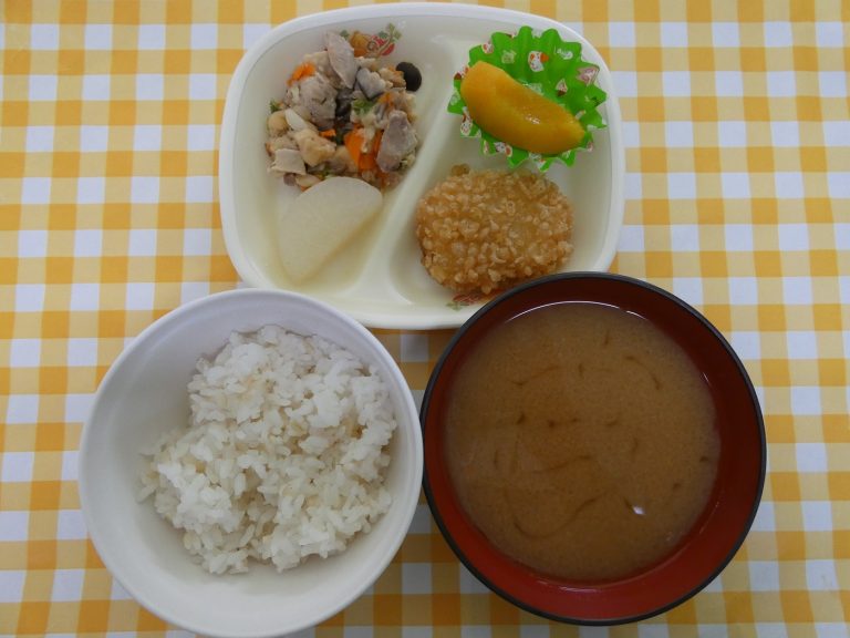・ごはん・中華スープ ・のり巻き唐揚・かぼちゃの煮付 ・千切り大根のマヨサラダ・りんご缶